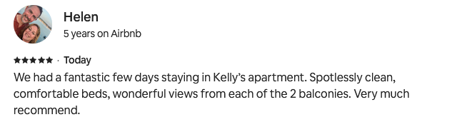 We had a fantastic few days staying in Kelly’s apartment. Spotlessly clean, comfortable beds, wonderful views from each of the 2 balconies. Very much recommend.