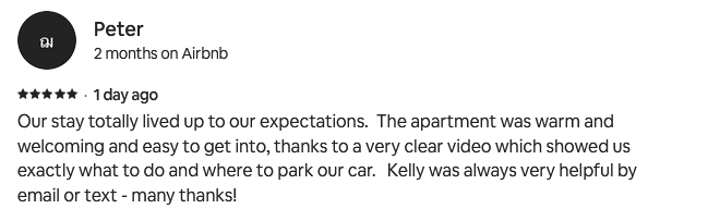 Our stay totally lived up to our expectations. The apartment was warm and welcoming and easy to get into, thanks to a very clear video which showed us exactly what to do and where to park our car. Kelly was always very helpful by email or text - many thanks!